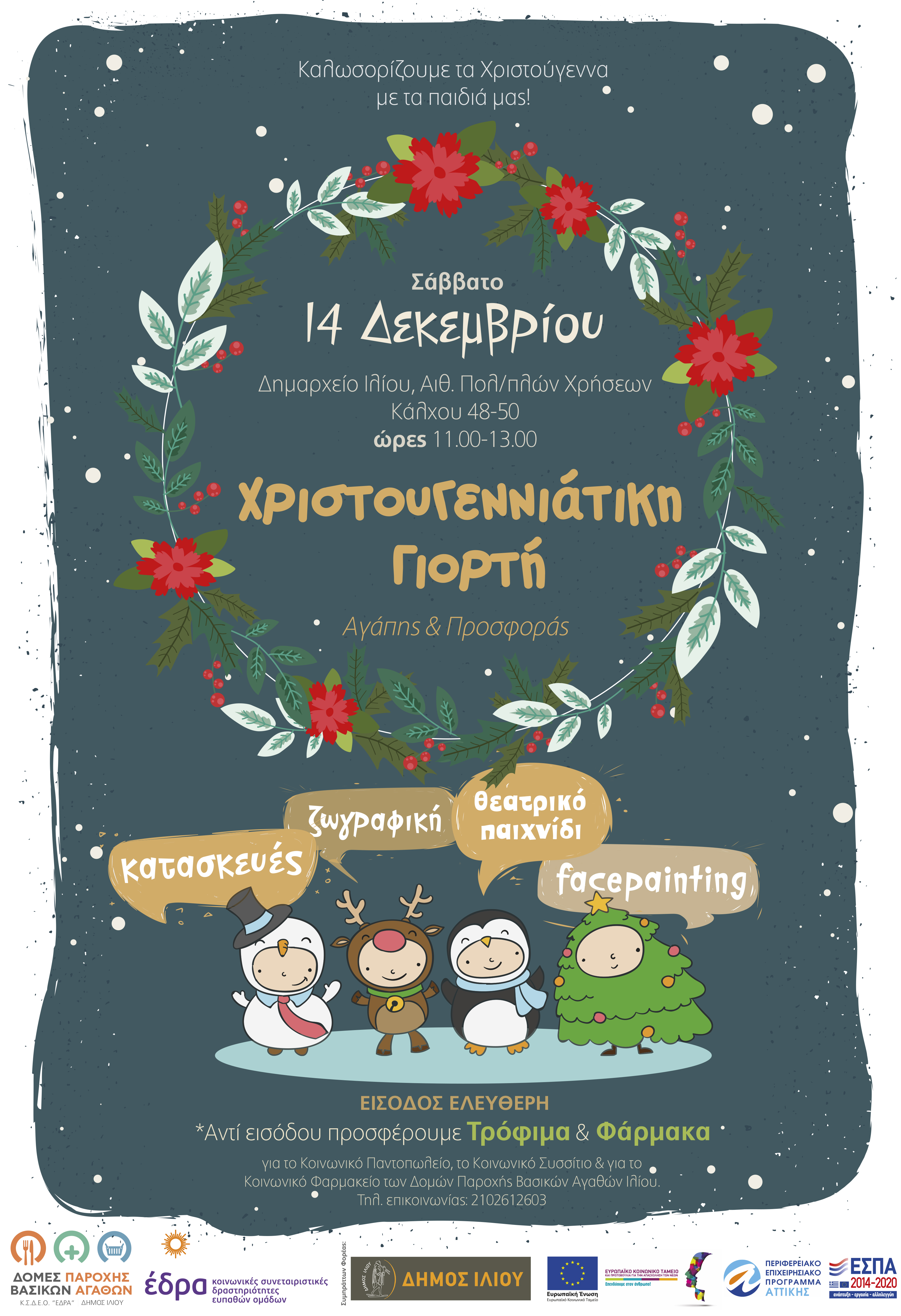 Οι Δομές Παροχής Βασικών Αγαθών Ιλίου διοργανώνουν Χριστουγεννιάτικη γιορτή αγάπης & προσφοράς για παιδιά προσχολικής και σχολικής ηλικίας με πολλές δραστηριότητες, όπως facepainting, θεατρικό παιχνίδι, κατασκευές και ζωγραφική! Συγκεκριμένα, η γιορτή θα πραγματοποιηθεί το Σάββατο 14 Δεκεμβρίου 2019 και ώρες 11:00-13:00 στην αίθουσα πολλαπλών χρήσεων στο Δημαρχείο Ιλίου (Κάλχου 48-50).